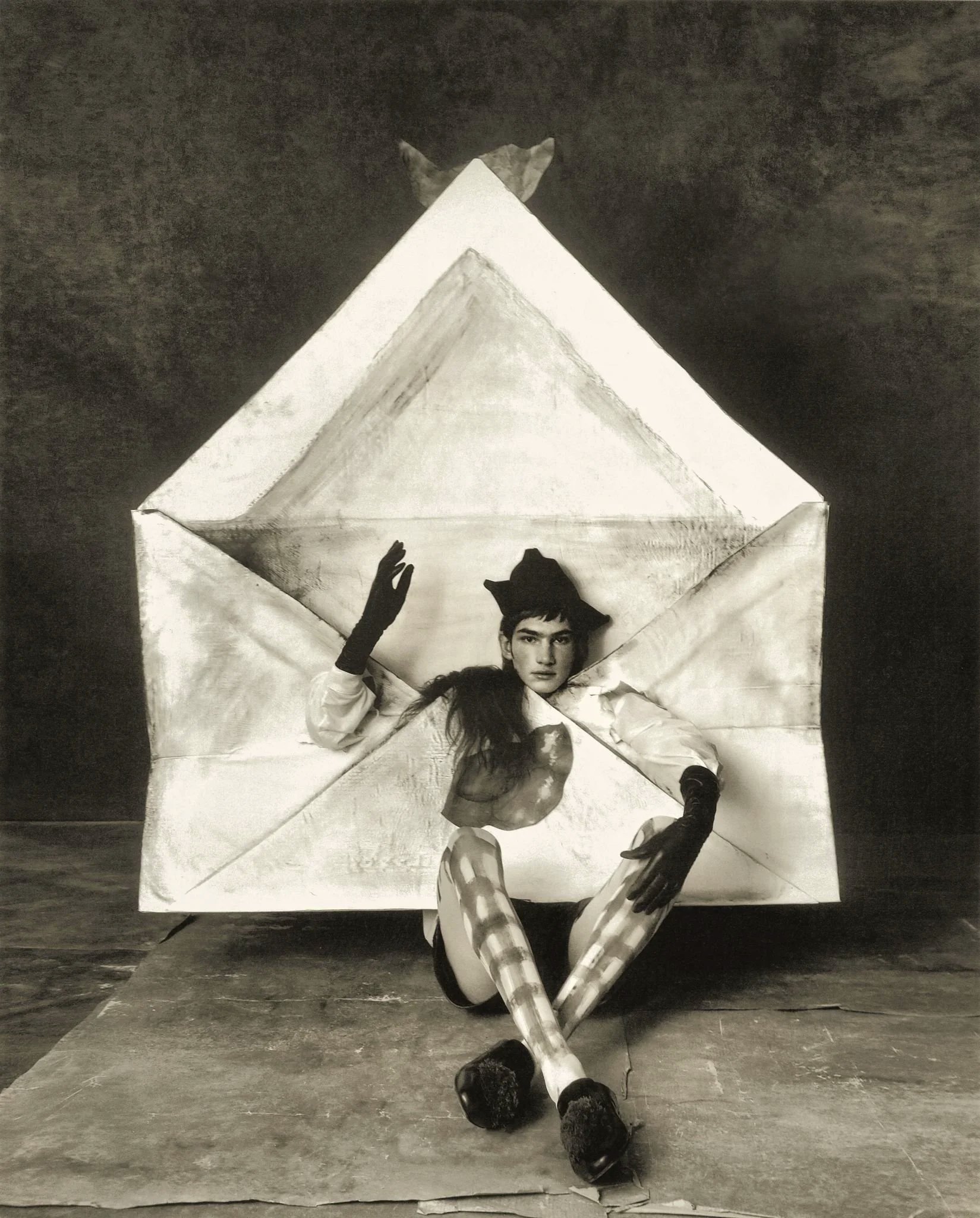 El motivo de la caja atraviesa su obra en múltiples formas: cubos donde el modelo queda confinado, suelos ajedrezados que repiten la geometría, tocados con siluetas de casa o, más recientemente, composiciones planas tipo flat-lay donde el cuadrado se vuelve elemento gráfico.