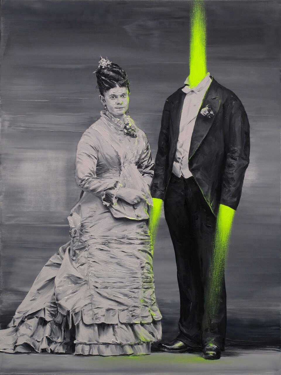 • Su técnica pictórica incluye el uso de fotografías vintage como base para sus obras.